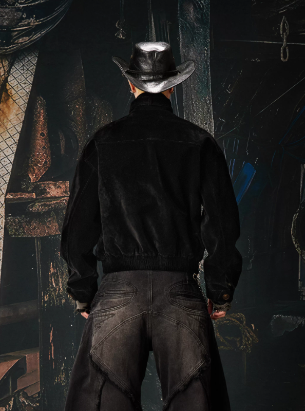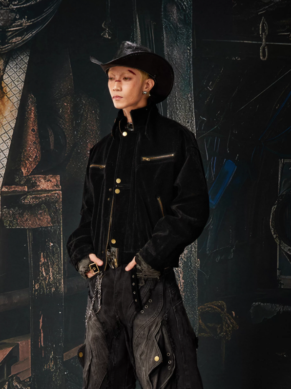Flocked Deconstructed Placket Zip & Snap Stand Collar Cropped Jacket (Unisex)
