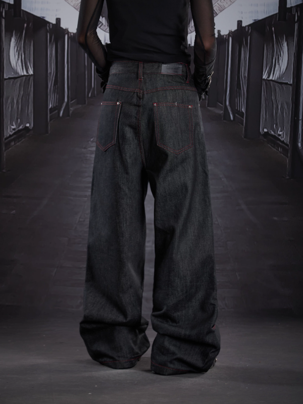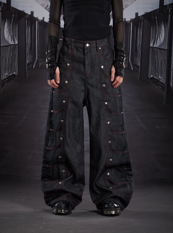 Heavy Deconstructed Studded Stitch Detail Oversized Straight-Leg Denim Pants (Unisex)