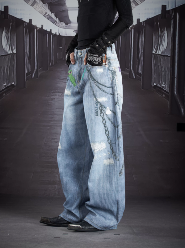 Statement pants for the fearless. Featuring bold 3D monster prints and metallic chain details, these oversized curved-leg trousers merge avant-garde artistry with practical streetwear functionality. Perfect for fashion rebels who value individuality.